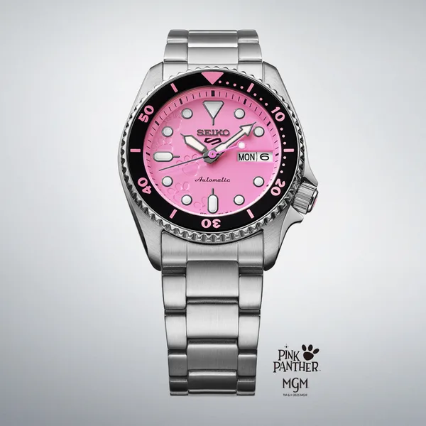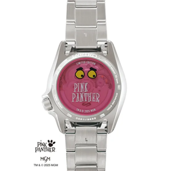 שעון Seiko 5 Sports KSX במהדורה מוגבלת המונה 9,999 יח' בכל העולם, בשיתוף עם Pink Panther המשלב עיצוב ספורטיבי קלאסי עם נגיעות משחקיות והשראה מעולם האנימציה של הדמות האהובה. גוף השעון עשוי פלדת אל‑חלד בקוטר 38.0 מ״מ ובעובי 12.1 מ״מ, עם בזל (טבעת מסתובבת) מסתובב חד‑כיווני שבו הספרות מודפסות בפונט ייחודי, לוח בגוון ורוד המזכיר את דמות ה‑Pink Panther וטביעות כפות רגל מובלטות שמופיעות כאלמנטים גרפיים על הלוח. המנגנון הוא 4R36 אוטומטי עם מתיחה ידנית, עתודת כוח של כ‑41 שעות, פונקציית עצירת מחוג שניות לתיאום מדויק, ותצוגת יום ותאריך. השעון מצויד בזכוכית Hardlex להגנה בפני שריטות, מחוגים וסימונים מצופי LumiBrite לקריאה מיטבית גם בתנאי אור חלשים, וצמיד פלדת אל‑חלד עם סוגר תלת‑קיפול עם לחצן שחרור לנוחות שימוש יומיומי. גב השעון כולל חריטה עם המילים LIMITED EDITION ומספר סידורי אישי וכן ציור גרפי של ה‑Pink Panther המסתתר ברקע, ועמידות במים עד 100 מ׳. בנוסף נכללת רצועת נאטו מתחלפת עם דוגמת טביעות כפות רגל וטקסט “WET PAINT” מהסדרה המקורית, מה שהופך את הדגם ליצירת אספנות מלאת אופי שמחברת סטייל, הומור ודיוק מכני.