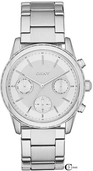שעון יד מסדרת שעוני דונה קארן החדשים בעיצוב משגע מתנה מושלמת לאישה.רקע כרונוגרף בגוון כסף בשילוב ספרות קווים ומחוגים מעוצבים, לוגו DKNY.