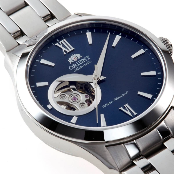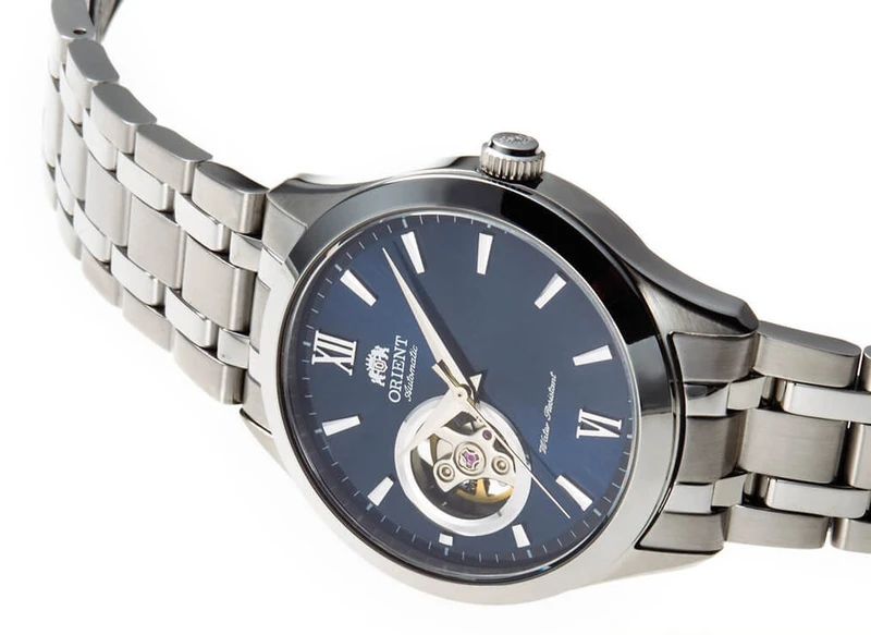שעון אוטומטי עכשווי זה של ORIENT העיצוב לוח השעון בגוון כחול בשילוב מחוגים בגוון כסף וסמני שעות אטרקטיביים, תכונת 'לב פתוח' השקועה בשעה 9 מציגה את היופי הפנימי, וכתר עם פונקציונליות של סלילה עצמית אוטומטית.