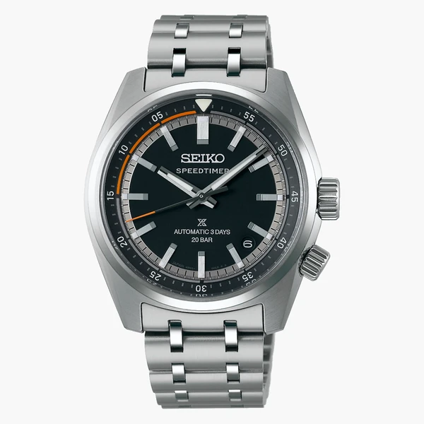שעון Seiko Prospex Speedtimer עם עיצוב בהשראה וינטאג'ית, המתאים במיוחד לחובבי שעוני ספורט פרקטיים עם נוכחות מודרנית. גוף השעון עשוי פלדת אל חלד בציפוי סופר קשיח, בקוטר 39.5 מ"מ, שמעניק לו מראה קלאסי עם עמידות גבוהה לשימוש יומיומי. לשעון לוח שחור עם מחוג שניות כתום בגימור מטאלי ותצוגת תאריך בעיצוב מעוגל בין השעות 4 ל�5, לקריאה מהירה ונוחה. מנגנון 6R55 אוטומטי עם עתודת כוח של כ�72 שעות (שלושה ימים) הכולל פונקציית עצירת מחוג השניות. אחד האלמנטים המיוחדים בעיצוב הוא בזל פנימי עם סקאלת ספירה לאחור, הנשלט באמצעות כתר נוסף בשעה 4 פיצר נדיר ומועיל שמאפשר מעקב אחר זמנים מבלי להעמיס על הלוח. זכוכית ספיר קמורה עם ציפוי אנטי רפלקטיבי פנימי מבטיחה קריאות מיטבית גם בתנאי תאורה חזקים. השעון עמיד במים עד לעומק של 200 מטר.