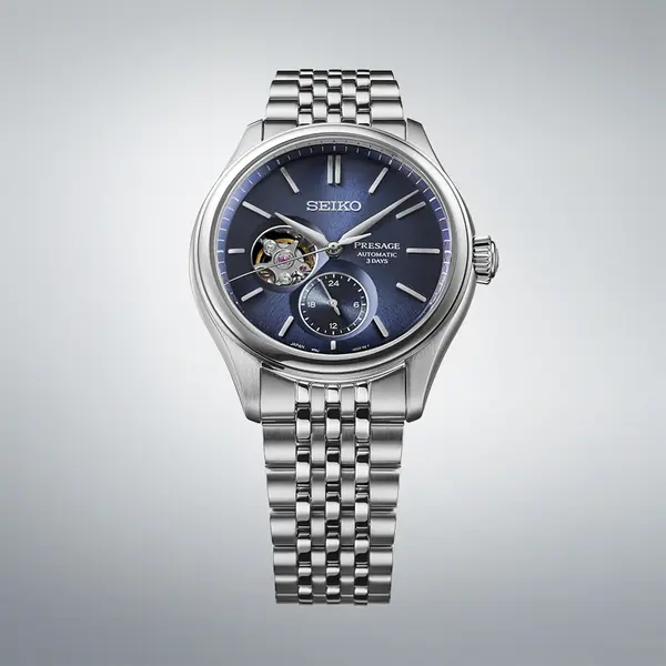 שעון Seiko Presage קלאסי מהסדרה Classic Series בגוון אינדיגו כחול שמכונה Ai-Iro כחול עמוק שמעורר תחושה של שקט ואלגנטיות. גוף השעון עשוי פלדת אל-חלד עם ציפוי סופר חזק להגנה מפני שריטות, בקוטר של 40.2 מ"מ, שמספק איזון מושלם בין נוכחות לענידה יומיומית. לוח השעון בשחור- כחול עם טקסטורה של בד רך, שממזגת את התרבות היפנית עם קו עיצובי מודרני, המחוגים והסימונים מתוכננים בקווים מדויקים שמשלימים את קו הבסיס המעוגל של הלוח. מנגנון השעון הוא 6R55 אוטומטי, עם עתודת כוח של כ-72 שעות, כולל פונקציית עצירת מחוג השניות לכיוונון מדויק. השעון מצויד בזכוכית ספיר כפולה-קמורה עם ציפוי פנימי אנטי-רפלקטיבי לקריאה מצוינת בתנאי אור משתנים. הוא עמיד במים עד 100 מטר ומאפשר שימוש נוח גם ביום יום. הגב של השעון שקוף ומאפשר הצצה למנגנון הפועל. הצמיד עשוי פלדת אל-חלד איכותית עם קישורים דקים ונעילה תלת-קיפול שמוסיפה נוחות ובטיחות.